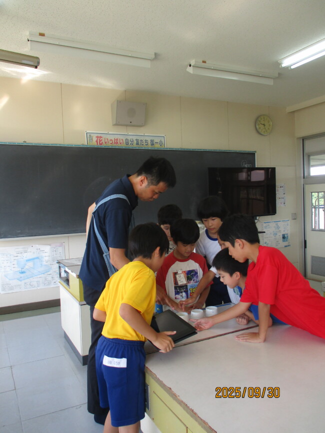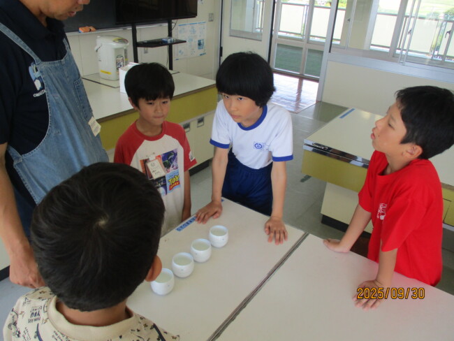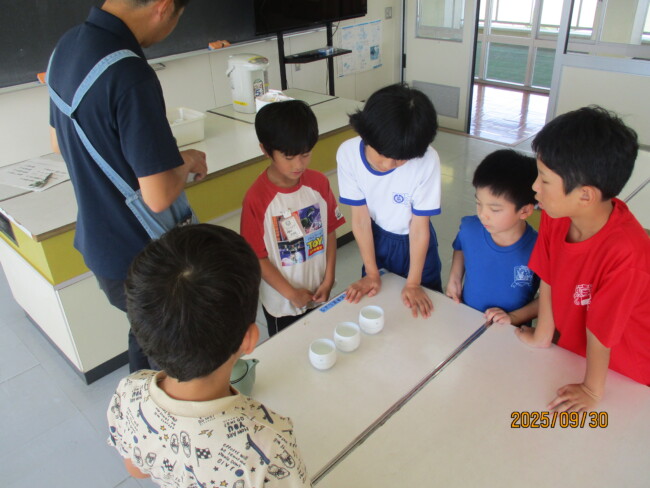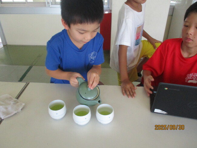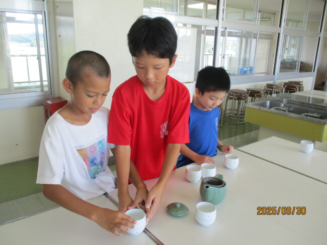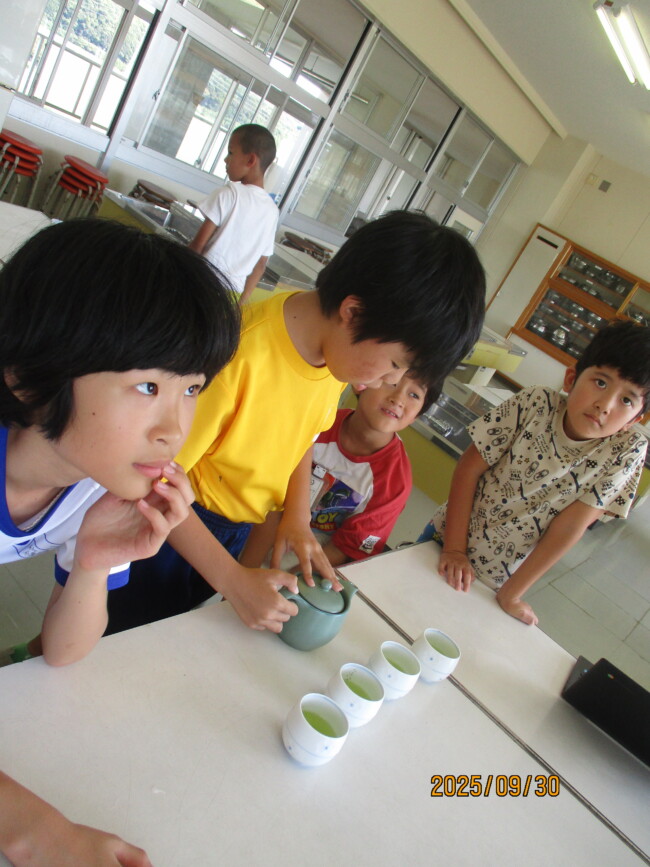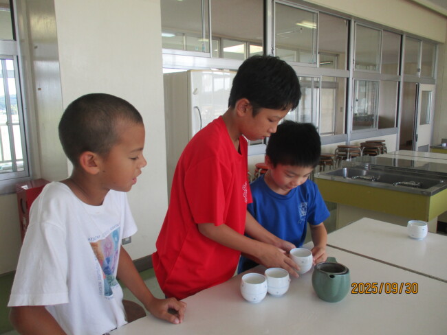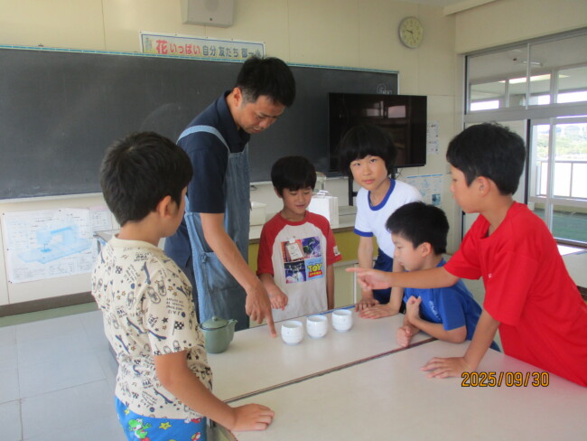 カフェを開くために、修行中のやまもも3組さん。この前は、まるよ茶屋さんでお客さん体験をし、接客について学んできましたが、この日は実際においしくお茶を入れる練習をしました。日本茶インストラクターの資格をもつ、栄養教諭さんが隣の中学校から教えに来てくれました。 やまももカフェの開店が待ち遠しいです。