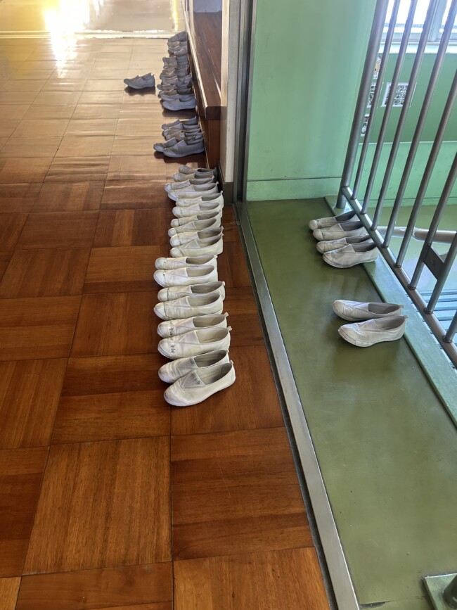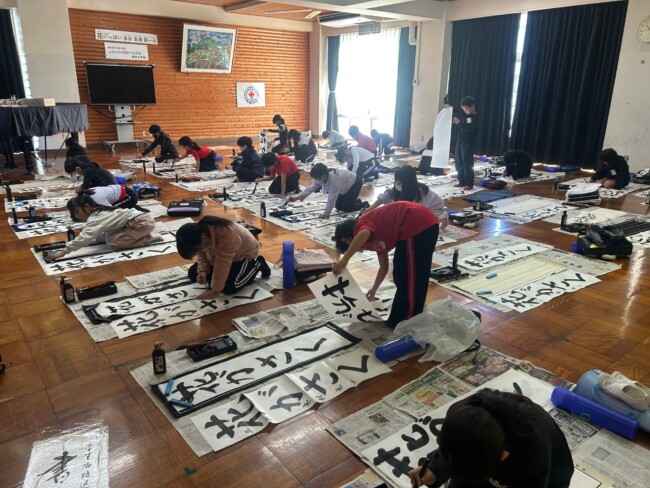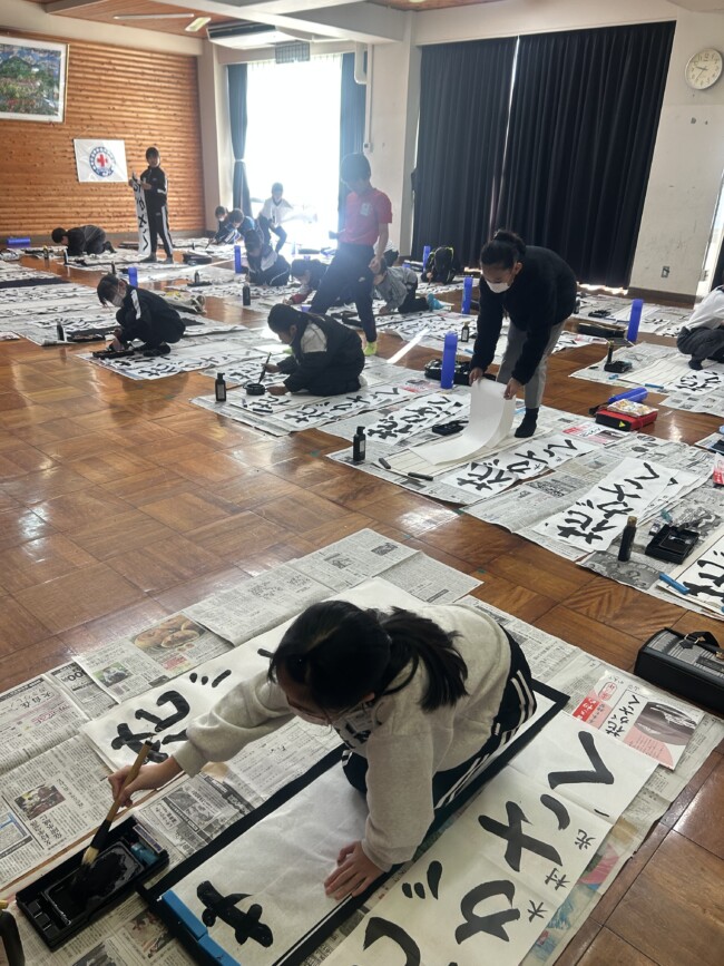 3年生は初めての書初め。廊下を通り過ぎてしまうほど、静かに集中して取り組んでいます。脱いだ上靴がきれいに整頓されていたのにも感心しました。