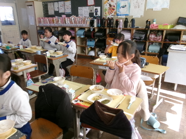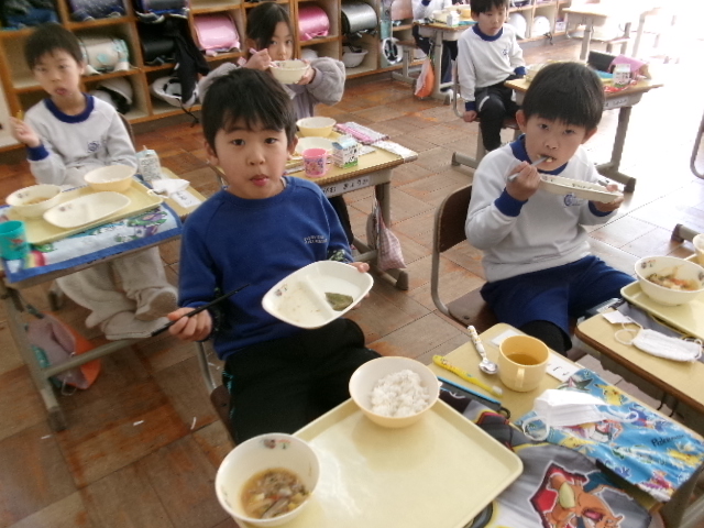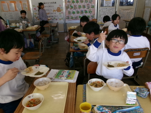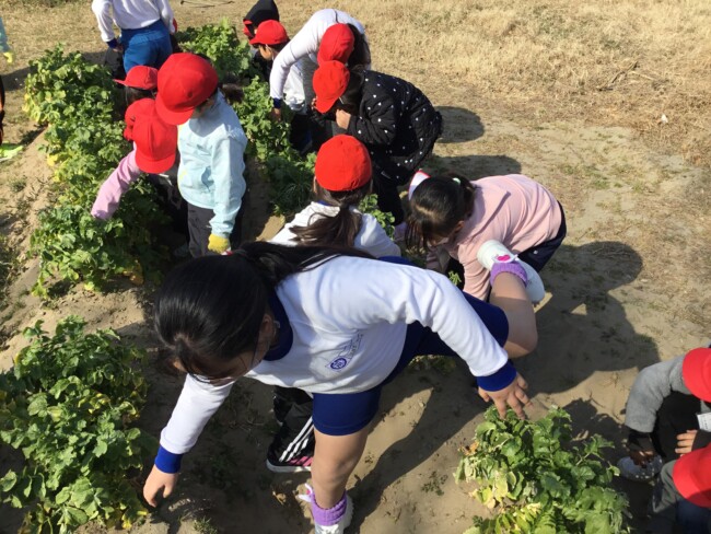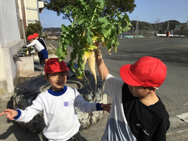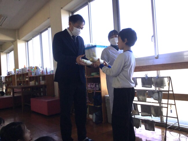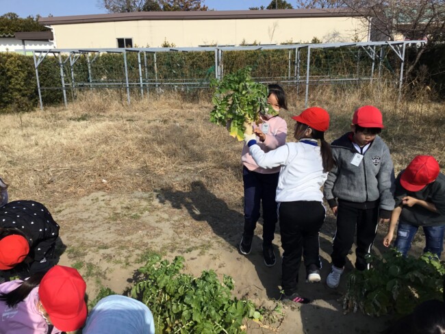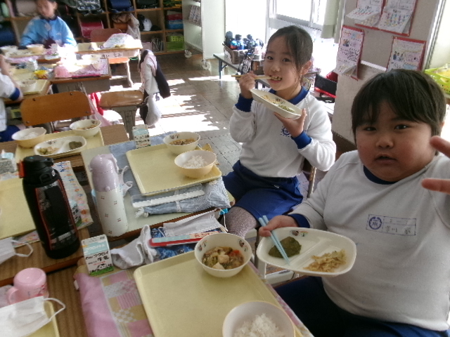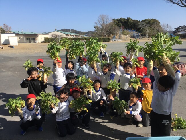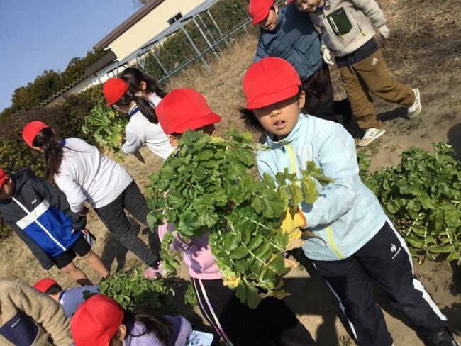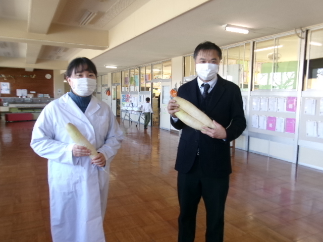 おいしい大根おいしい給食 2026/02/02 木曜日の給食の大根サラダは、2年生が育てた大根を使ったものでした。 収穫・贈呈式・調理の様子・食べている様子をまとめてどうぞ。 1年生の教室にもおじゃまして、「2年生が作った大根なんだよ」というと、お代わりしている子も いました。1年生の写真も入っています。 給食センターの先生たち