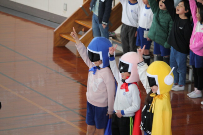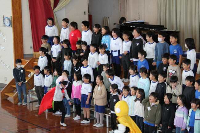 2年生がこっそり練習を重ねてくれていた「オンイチマンの歌」。約20年ぶりの復活です。 お昼休みの体育館で、お披露目コンサートがありました。たくさんの子が来てくれて、 2年生も少し緊張気味でしたが、いざ始まると、いつものように元気に歌ってくれました。アンコールでは、かわいい3色のオンイチマンも登場し、手拍子で大盛り上がりでした。