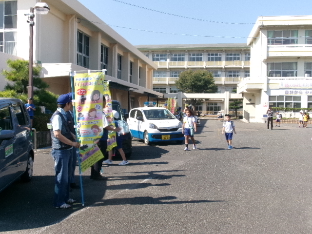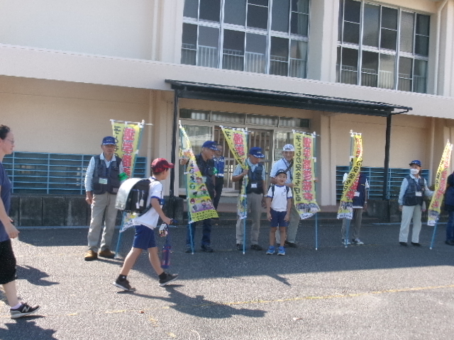 少し前のできごとですが、9月8日は防犯協会や地域のみなさんが、低学年の下校に合わせて子どもたちの見守りをしてくださいました。