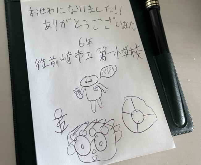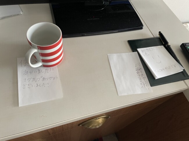ホテルの方へのお礼のメッセージがあり、忘れ物チェックの教員が感動していました。